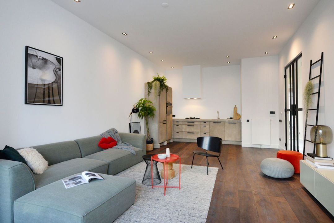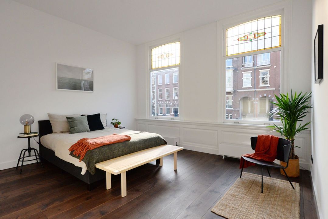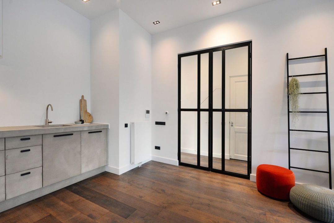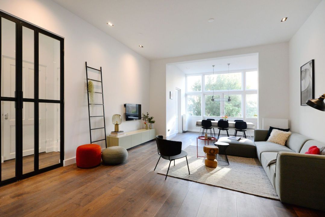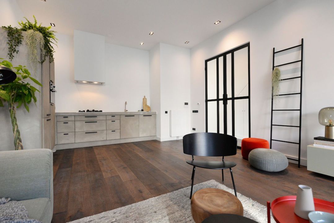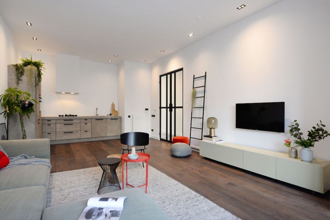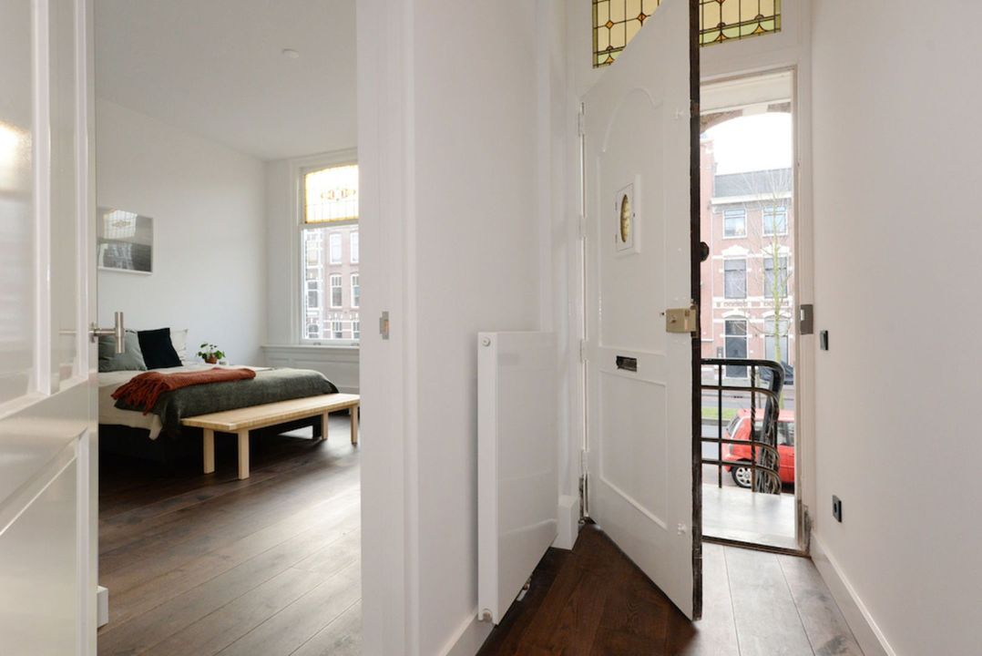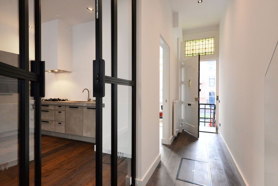 Het appartement beschikt over 3.5 meter hoge plafonds en grote raampartijen. De dubbele openslaande stalen deuren bieden toegang tot de bijzonder ruime woon/eetkamer met luxe keuken en grote wandkast met verlichte nissen. Het appartement heeft twee slaapkamers en een luxe badkamer met inloopdouche, inbouwkranen en afwerking met beton-ciré. De entree van dit appartement is via eigen voordeur op de bel-étage.
