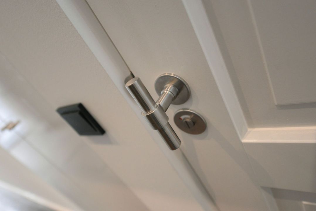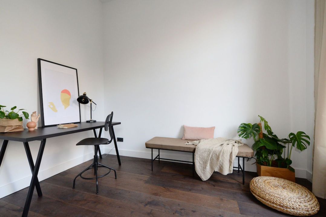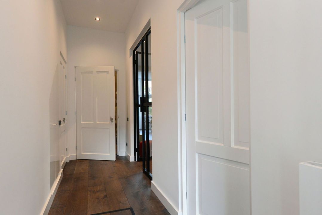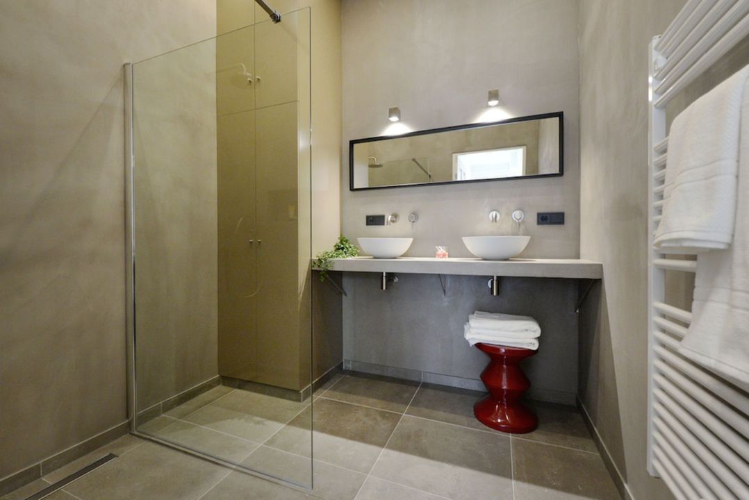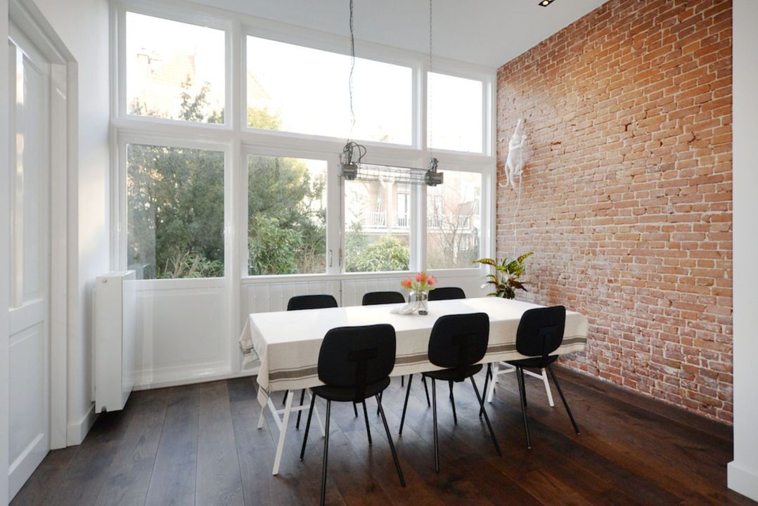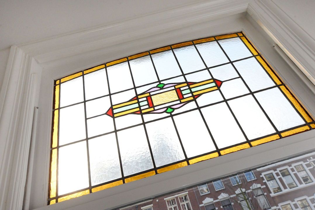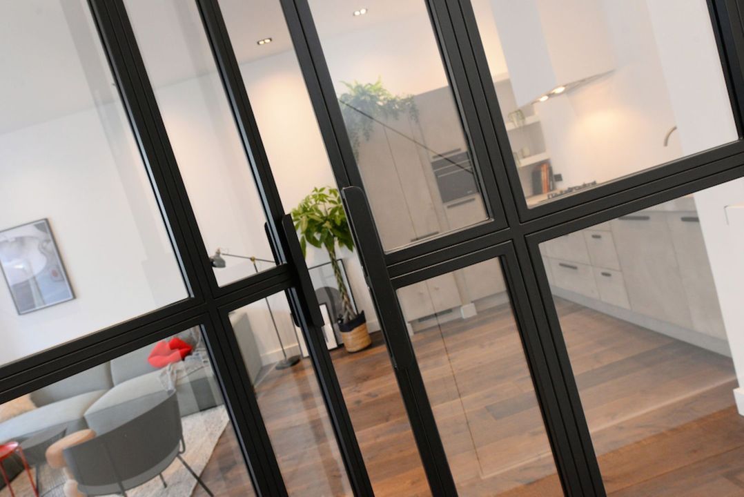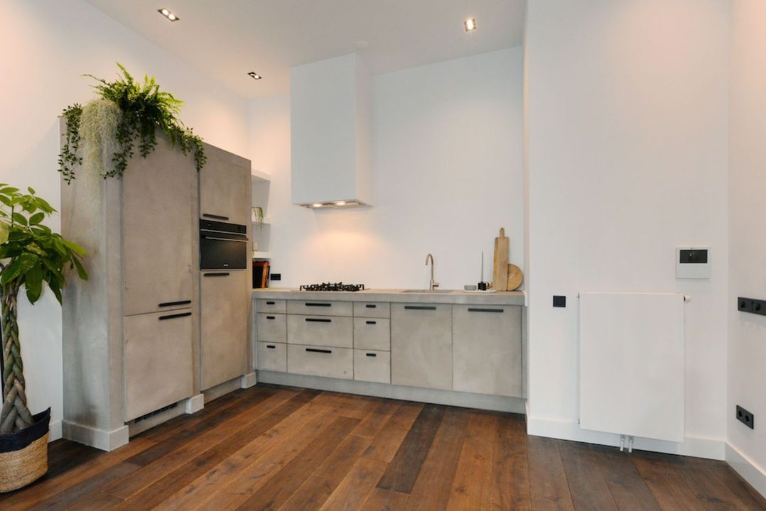 Het appartement beschikt over 3.5 meter hoge plafonds en grote raampartijen. De dubbele openslaande stalen deuren bieden toegang tot de bijzonder ruime woon/eetkamer met luxe keuken en grote wandkast met verlichte nissen. Het appartement heeft twee slaapkamers en een luxe badkamer met inloopdouche, inbouwkranen en afwerking met beton-ciré. De entree van dit appartement is via eigen voordeur op de bel-étage.