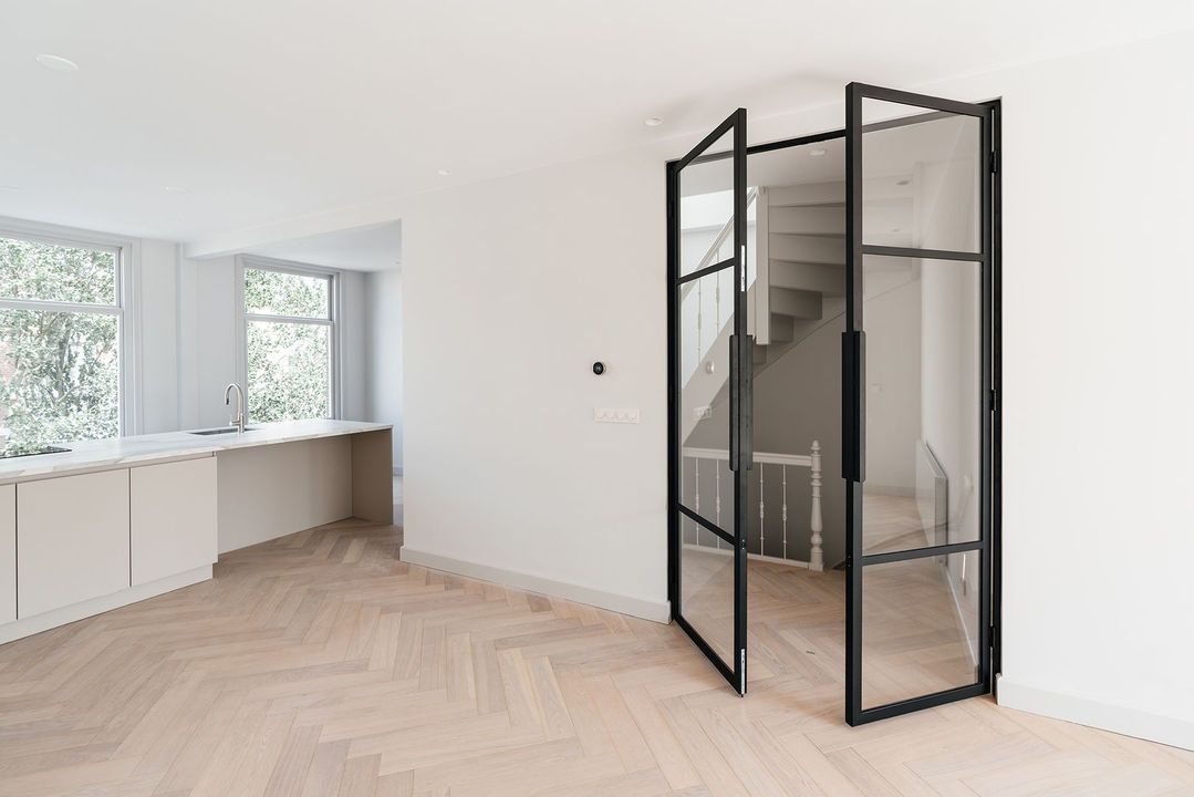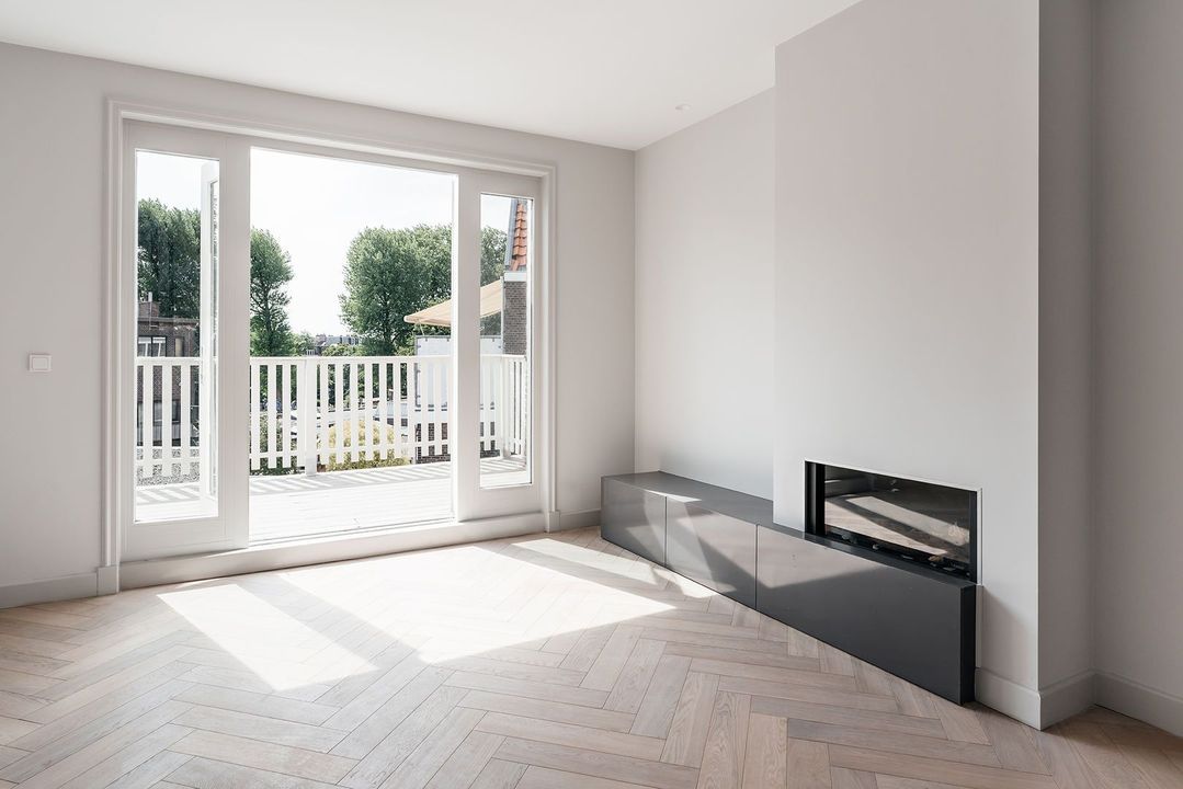 De woonverdieping is voorzien van een eikenhouten vloer, gelegd in visgraatpatroon. De keuken bestaat uit een groot kookeiland van 3.5 meter breed met barretje. Vanuit de woonkamer bieden openslaande deuren toegang tot het zonnige terras met vrij uitzicht. Tevens is de woning voorzien van een gashaard, stalen entreedeuren naar de woonkamer en inbouwspots.